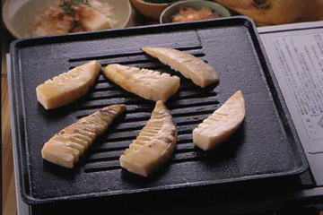 加熱燒烤板,將竹筍排好,猛火燒至兩面熟,將調料涂在竹筍上繼續烤。烤至變色出鍋后加木魚花和山椒葉即可