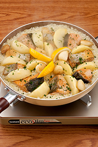 - 鮭魚除骨切成3段,加適量鹽和醬油腌制(分量外)。土豆去皮,縱切6片浸泡水中,再撈至篩子上去水分。洋蔥切碎,大蒜剝皮備用,往湯內加入海鮮素攪融備用