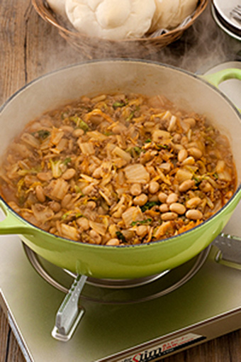 - 撒上辣椒粉,放上白菜菜干大火炒至菜干柔軟通透后,再放上菜葉和大豆一起炒。