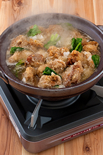 鍋中加調料B并煮開,加油炸雞塊和小松菜煮熟。放入蘿卜泥迅速加熱,連同湯汁盛出來即可。