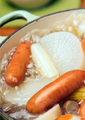 鍋內放入各種蔬菜和香腸,把水添到剛沒過來的程度,大火燜煮。煮開后撇去沫渣,放入木魚精、白葡萄酒和月桂皮并蓋上蓋子用較弱的中火熬煮。