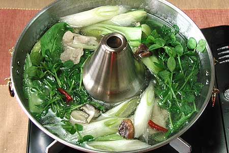 在鍋中倒入水,蒜,生姜,紅辣椒,雞胸肉開火烹煮。