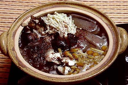 瓦鍋放入海帶和水。加上菇類和魔芋開火煮熟即可。